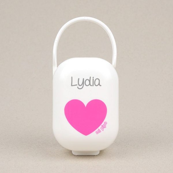 Original cajita blanca portachupetes personalizable con el nombre de tu bebé decorada con el dibujo de un corazón en color fucsia. Cierre a presión y con asa para colgar del carrito.