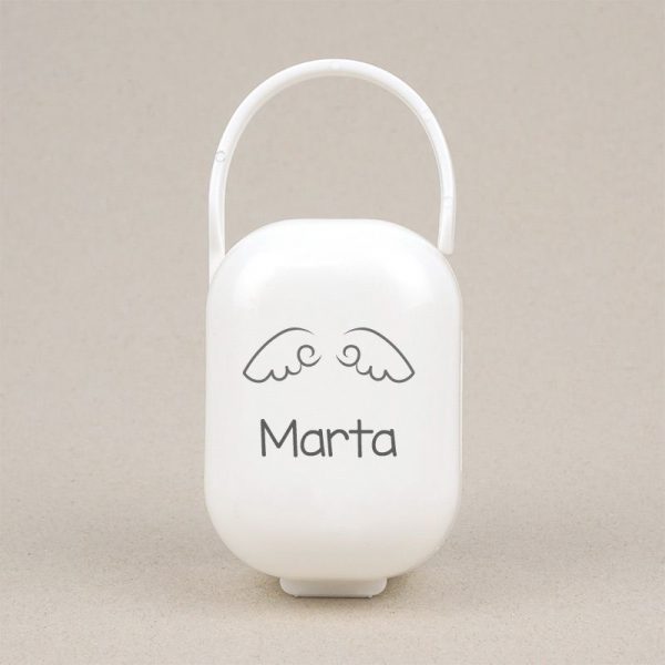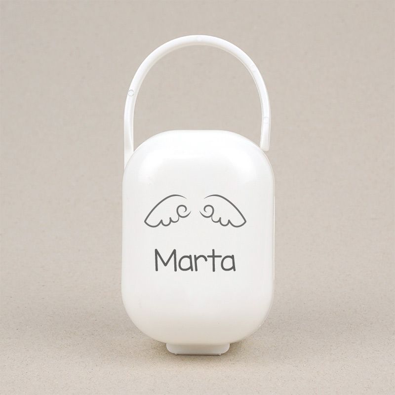 Original cajita portachupetes personalizable con el nombre de tu bebé decorada con el dibujo de unas alitas de ángel disponible en varios colores. Cierre a presión y con asa para colgar del carrito.