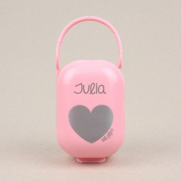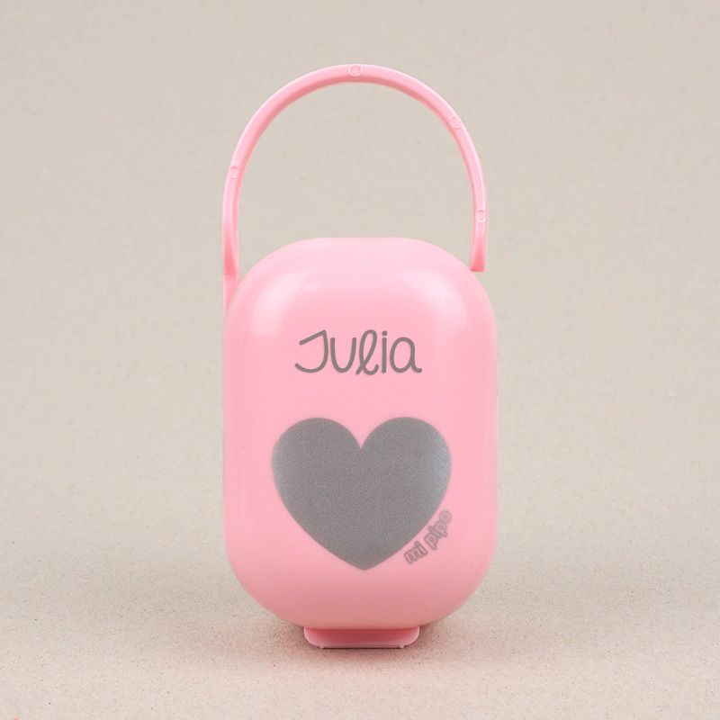 Original cajita portachupetes de color rosa personalizable con el nombre de tu bebé decorada con un corazón en color plata. Cierre a presión y con asa para colgar del carrito.