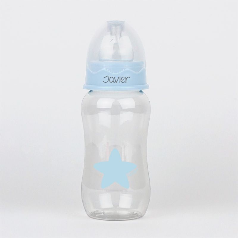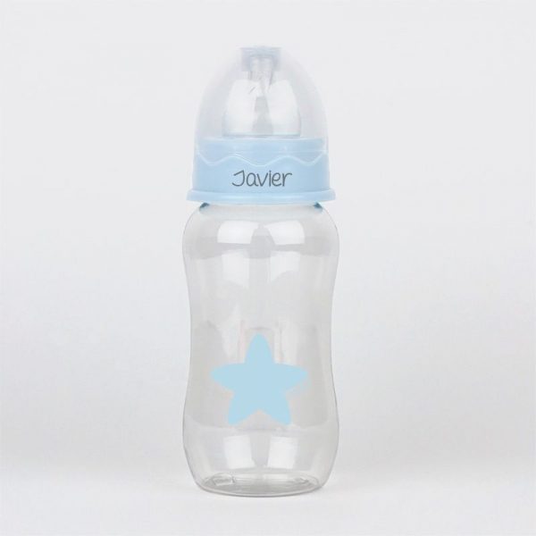 Bonito biberón en color azul de 300 ml de capacidad personalizado con el nombre de tu bebé decorado con un dibujito de un corazón