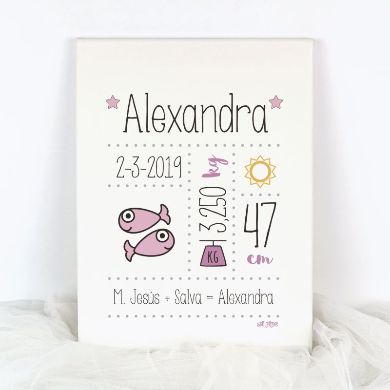 Original lienzo realizado en Tela de algodón estampado montado sobre estructura de madera. Recuerda todos los datos del nacimiento  con este bonito lienzo supercompleto. Puedes personalizar el nombre del bebé, su fecha de nacimiento, peso, medida, símbolo del zodiaco, el tiempo que hacia el día de su nacimiento y el nombre de los papás.