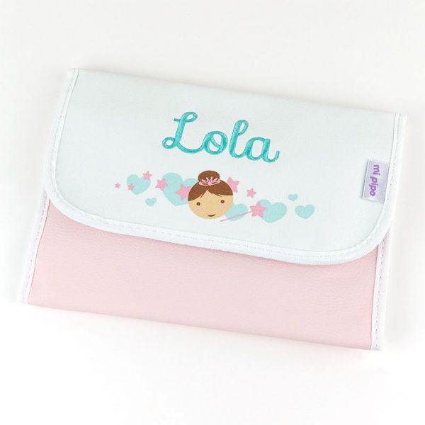 Original portadocumentos de polipiel personalizado con el nombre bordado en color blanco y rosa decorado con un hada en campo de estrellas, con cierre de velcro muy fácil de limpiar.